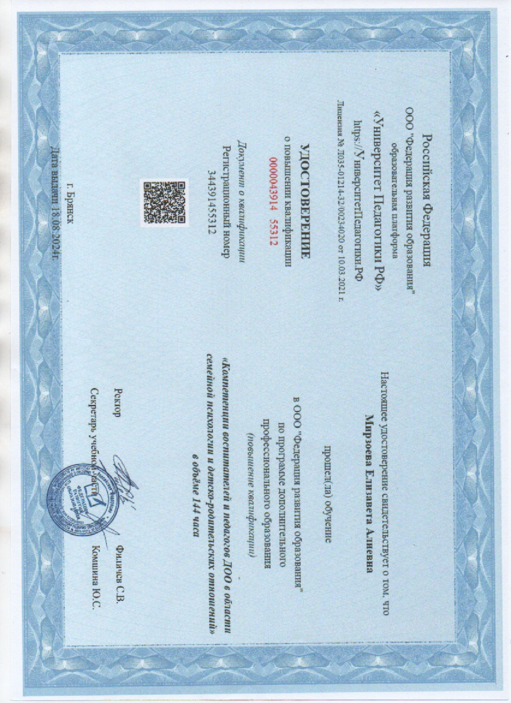Данные о повышении квалификации или (и) профессиональной переподготовке:
