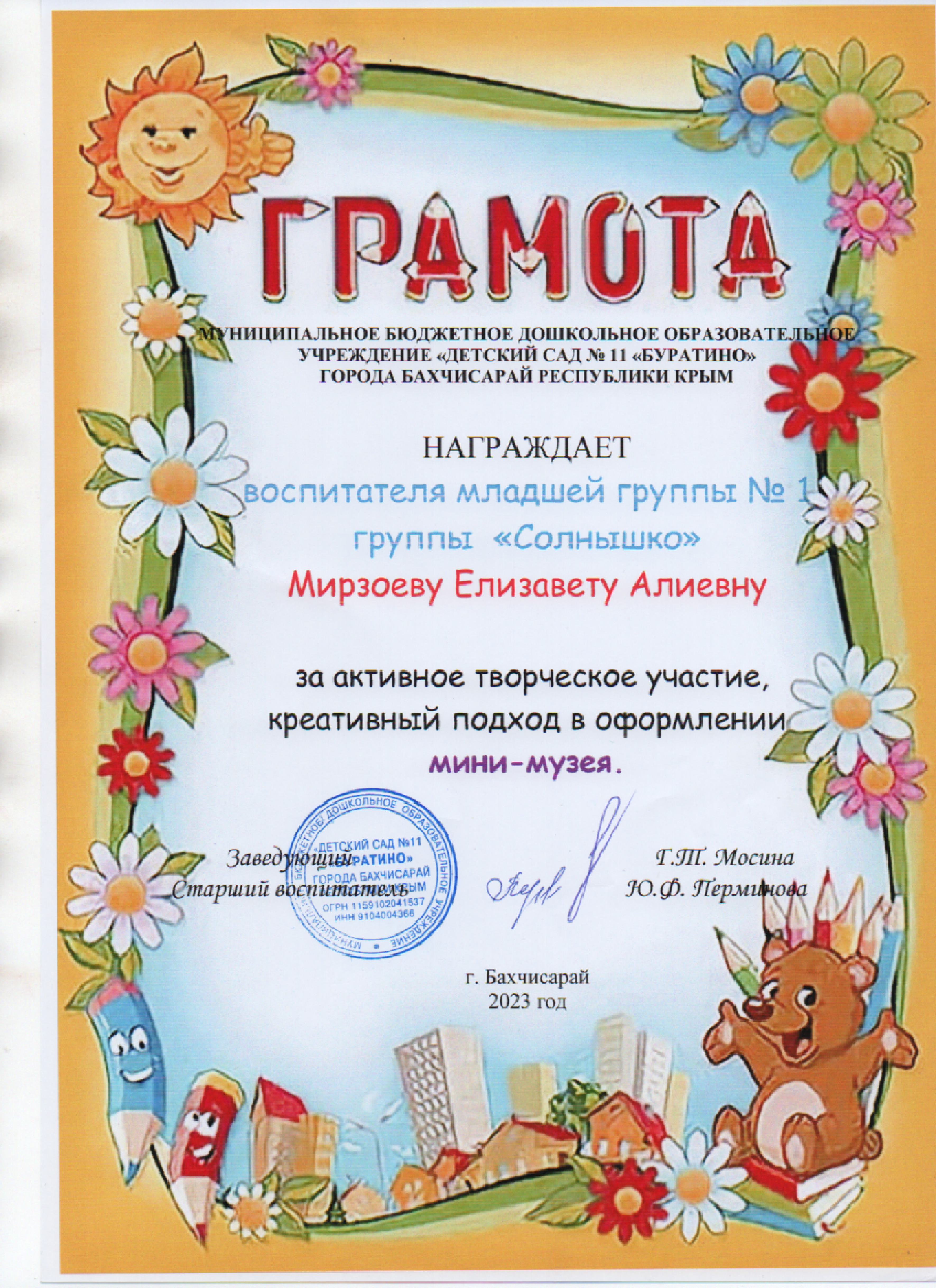 Это не просто занятия по расписанию, а увлекательное путешествие в волшебный мир детства, которое я разделяю с каждым малышом. Я искренне верю, что детский сад - это та самая основа, на которой строится счастливое будущее наших детей! Мой Путь к Сердцам ДетейКаждый ребенок – это уникальный мир, полный талантов, мечтаний и безграничного потенциала. Моя миссия как воспитателя – помочь этому миру раскрыться, стать ярче и увереннее. Я не просто учу детей, я учу их жить, чувствовать, понимать себя и окружающих. Мое кредо простое и глубокое : " Каждый ребёнок - это целый мир, который ждёт своего открытия". |